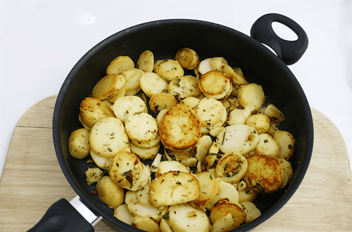 Cut each potato in half, then slice into 1 cm thick rounds. Heat oil in a large skillet over medium heat until it starts to smoke slightly. Place the potatoes in the skillet, spreading them evenly, and salt.