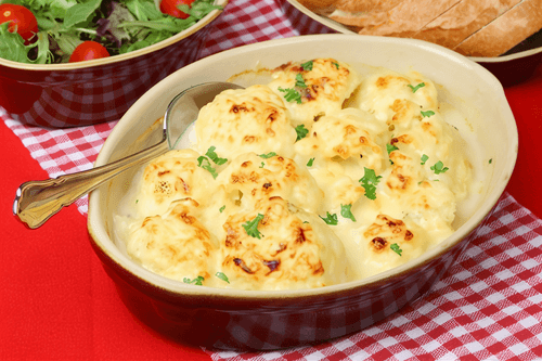 Pour some sauce into the baking dish and sprinkle with half of the finely chopped capers. Then place the cauliflower florets, pour the remaining sauce, and scatter the remaining capers. Top with breadcrumbs and pieces of the remaining butter.