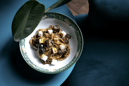Pasta with eggplant and sirtaki