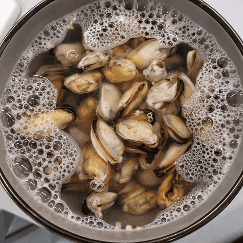Pour boiling water over the mussels and let them sit for 1.5 minutes. Then drain the water. The amount of boiling water depends on the depth and width of the dish: the water should completely cover the mussels.
