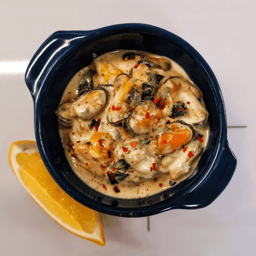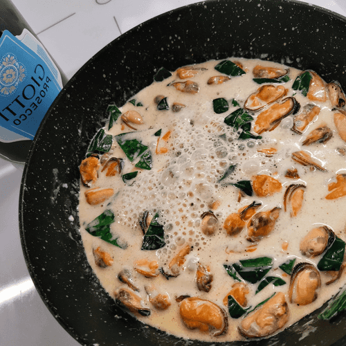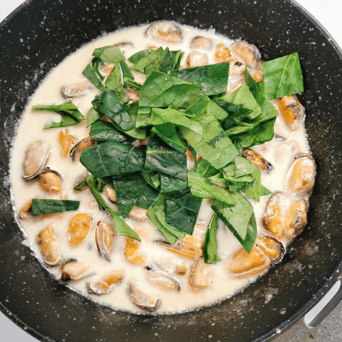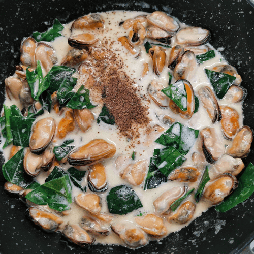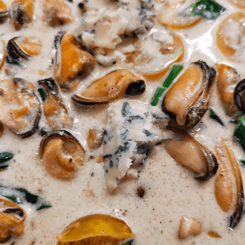 Creamy mussels in dorblu sauce with spinach