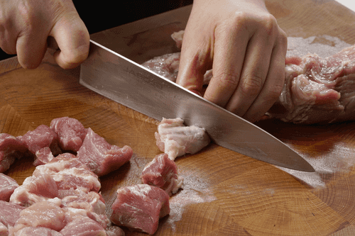 Cut the bell pepper and onion into cubes the size of the pork pieces.
