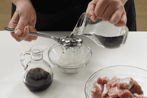 Mix half of the starch, 70 ml of cold water, and 2 tablespoons of soy sauce. Combine the mixture with the meat and let it sit for 15-30 minutes.
