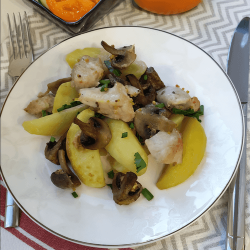 Turkey with potatoes and mushrooms baked in the oven is a dish that combines the tenderness of the bird, the rich flavor of champignons, and the soft texture of potatoes. This combination of ingredients is characteristic of Russian cuisine, which values simplicity and the natural taste of products. The mustard sauce makes the meat juicy and aromatic, while baking at high temperatures creates an appetizing golden crust. This dish is perfect for family dinners or festive tables and can be complemented with fresh herbs to enhance the flavor. Baked turkey with vegetables is not only delicious but also healthy since turkey is rich in protein and mushrooms add unique aroma notes. The dish is easy to prepare and does not require complex ingredients, making it an excellent choice for cozy home meals.