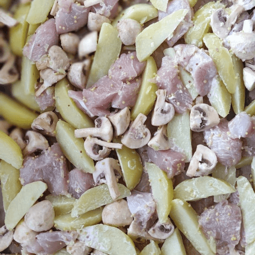 Place mushrooms, potatoes, turkey fillet in a deep container and add sauce. Season with salt and pepper to taste and mix well.