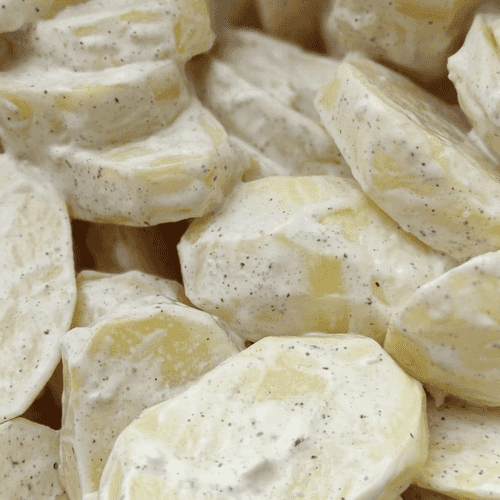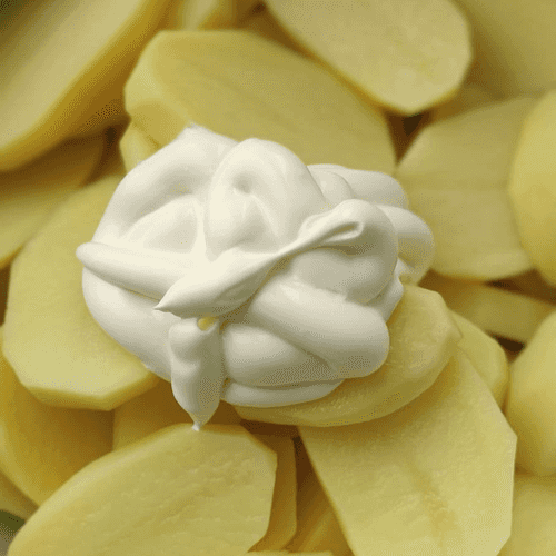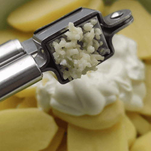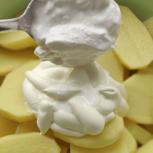 Mix the potatoes well with mayonnaise, sour cream, garlic, salt, and pepper.