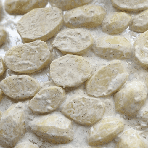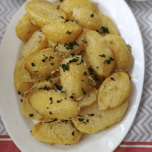 Oven-baked potatoes with garlic is a simple and aromatic dish of Russian cuisine that has won the love of many generations. Baked potatoes acquire a tender, crispy crust, while garlic adds a piquant depth of flavor. Mayonnaise and sour cream soften the texture, enveloping each slice in creamy tenderness. This dish is perfect as a side for meat or fish or as an independent snack. Dill adds freshness and highlights the natural taste of potatoes, creating a harmonious blend of aromas. The dish requires no complex ingredients; it is easy to prepare and always delights with its rich flavor. Oven-baked potatoes with garlic are a cozy, warming treat that is perfect for family lunches and friendly gatherings.