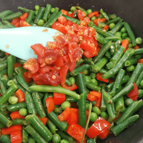 After 3 minutes, chop the tomatoes and add them to the stew. Stir.