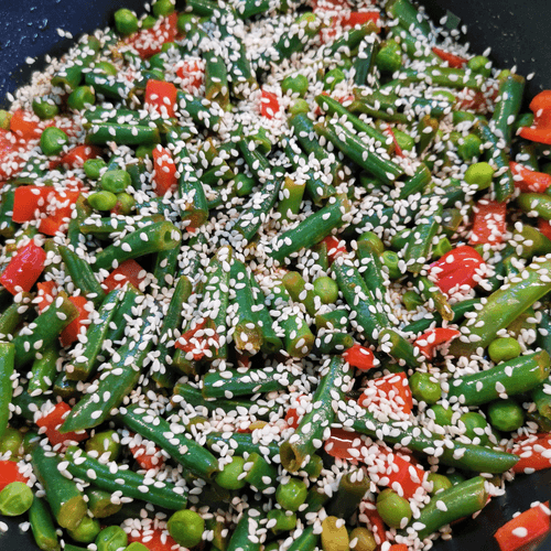 Transfer to a deep dish, sprinkle with white and black sesame seeds, and serve.