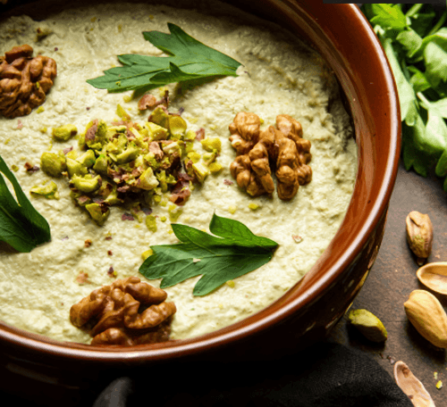 Mix nuts, roasted mixture, greens and spices, pour in duck broth, blend until smooth - it should become a delicate puree. Pour the resulting mixture over the meat, garnish with greens and whole halves of walnuts. A restaurant dish is ready at home, enjoy your meal!