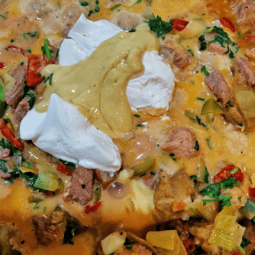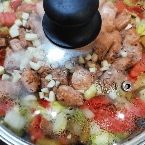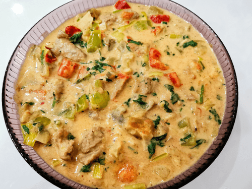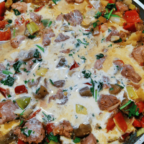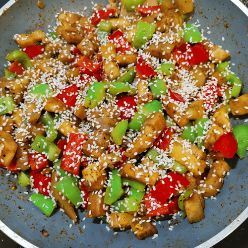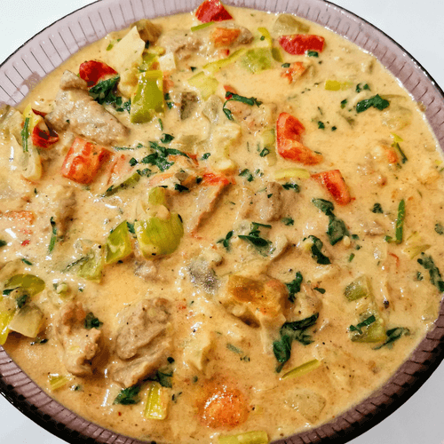 Hungarian goulash is a fragrant and rich dish that embodies the spirit of Hungarian cuisine. Its roots trace back to medieval Hungary when shepherds cooked hearty meat soup in cauldrons over an open fire. Over time, the recipe evolved, enriched with spices and vegetables. This version of goulash features tender pork, bell peppers, eggplants, and tomatoes with a deep, spicy flavor accented by a hint of sumac's tartness and chili's heat. Creamy sour cream adds tenderness to the dish while sesame provides a pleasant texture. Hungarian goulash pairs excellently with fresh bread or traditional sides, making it an ideal choice for family lunch or cozy dinner.