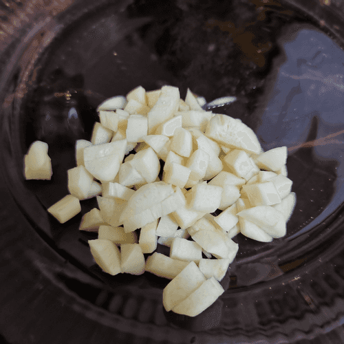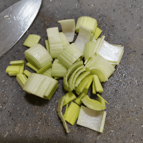Peel the eggplant and slice it. Chop the sweet pepper and ramiro into small pieces.