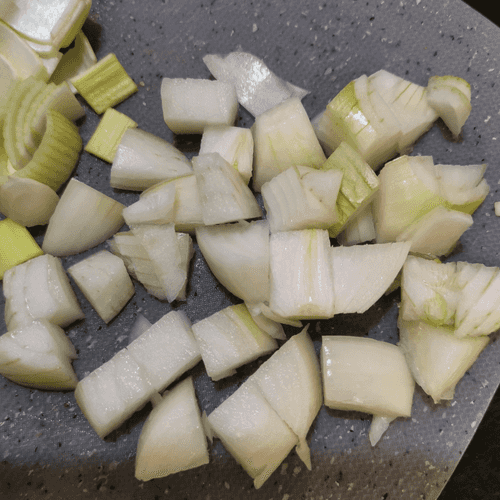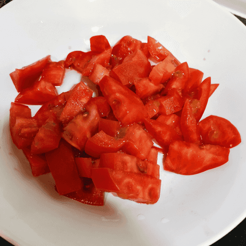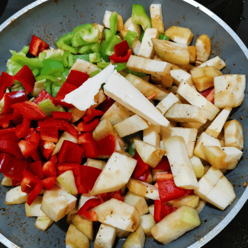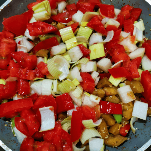 After another 3 minutes, add tomatoes and two types of onions. Stir.