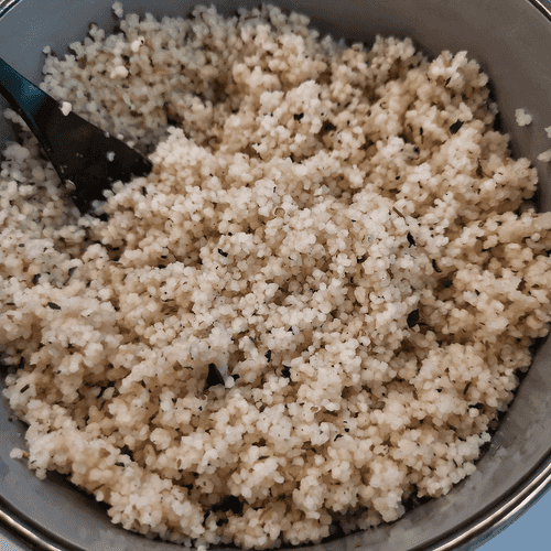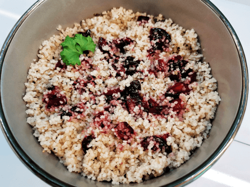 Couscous with cherry topping is a harmony of flavors where airy grains combine with juicy, caramelized berries. This dish is a creative reinterpretation of traditional couscous enriched with notes of marjoram and basil that add a savory aroma. A delicate balance of salt and pepper blend reveals depth of flavor, while wine vinegar adds a gentle tang that highlights the sweetness of cherries. The couscous turns out soft and fluffy, while the cherries provide brightness and freshness. It’s an ideal option for a light yet exquisite dinner or side dish that can be served warm or chilled. It pairs wonderfully with white wine or herbal tea and is suitable for a summer picnic or festive table.