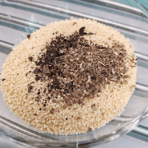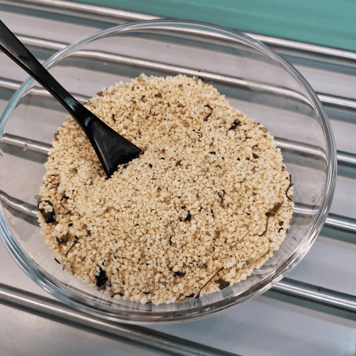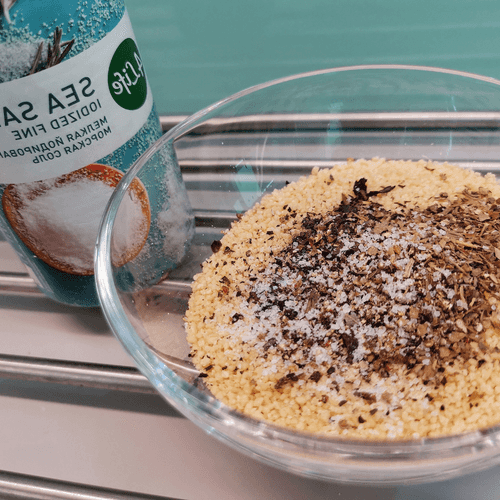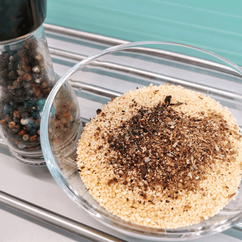 Pour couscous into a deep bowl, add marjoram and oregano (red basil).