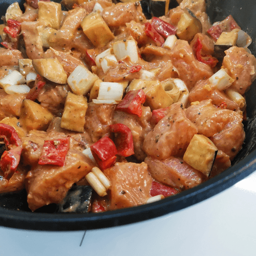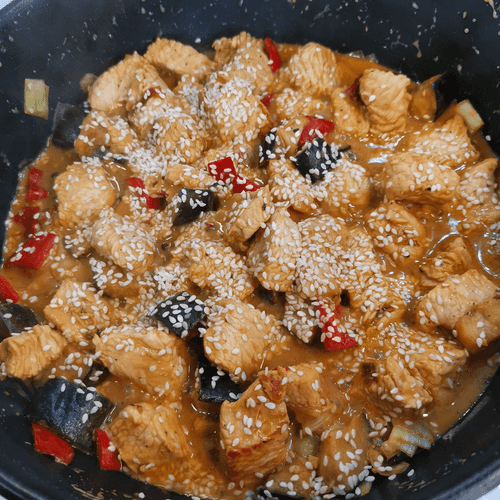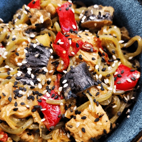 Turkey and shirataki noodle wok is an unusual and light dish that combines tender turkey meat with amazing shirataki noodles. This recipe, inspired by Japanese traditions in an author's kitchen, values the balance of flavors and textures. Sweet ramiro pepper, spicy Dijon mustard, and rich soy sauce add brightness to the dish, while sesame adds a pleasant nutty note. Shirataki noodles, which are almost calorie-free, make this wok an ideal choice for those watching their diet. All ingredients are marinated beforehand, making the meat especially juicy. The dish is quick and easy to prepare, making it a great option for an Eastern-style dinner. Served hot and sprinkled with sesame seeds, it pairs perfectly with greens or fresh vegetables.