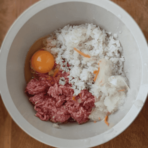 Grate the second half of the onion on a coarse grater. Place the minced meat, rice, egg, and grated onion in a deep bowl.