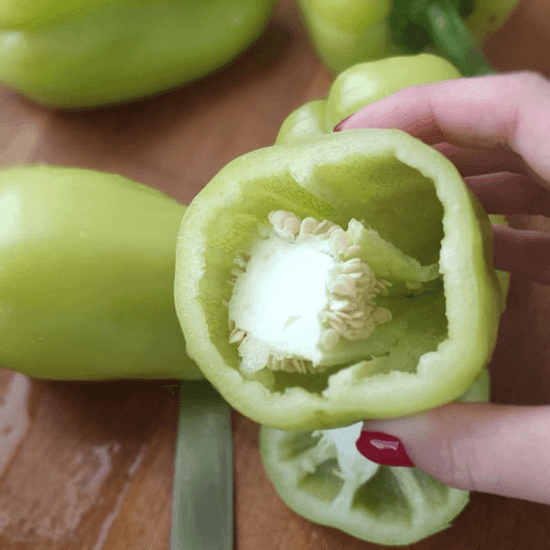 Cut off the top of the pepper and remove the seeds and veins.