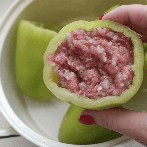 Use a tablespoon to stuff the pepper with minced meat.