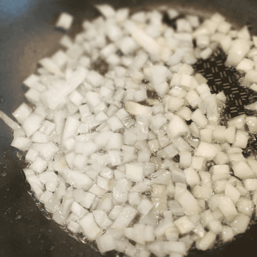 Prepare the sauce. Fry the onion until golden.