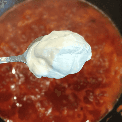 Add a spoon of sour cream to the mixture and stir. Season with salt and pepper to taste.