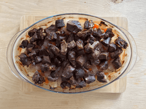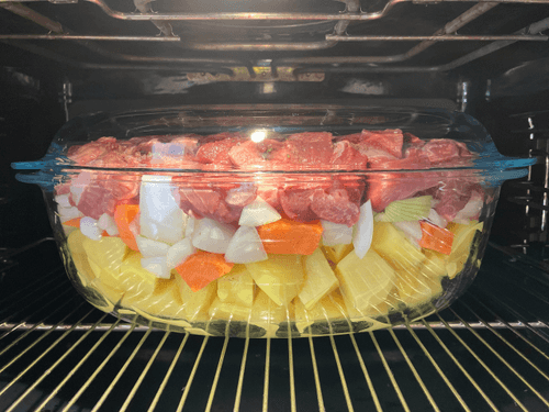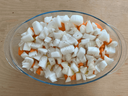 Place potatoes, onions, and carrots at the bottom of the dish. Salt and sprinkle with spices.