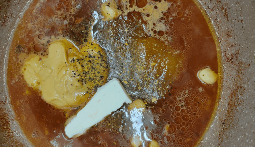 While the meat rests and absorbs the oil, melt honey, mustard, butter, and pepper in a small amount of water (about 100 g) in the pan.