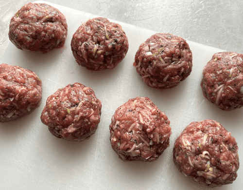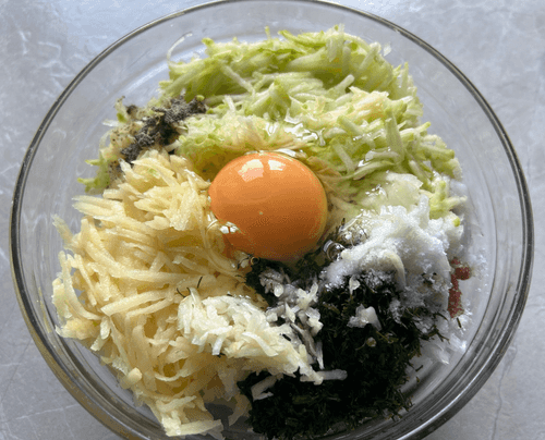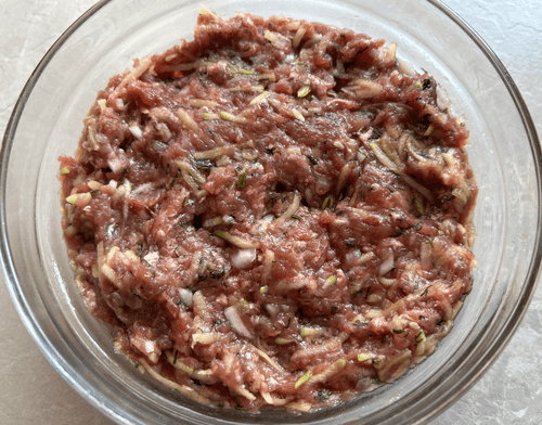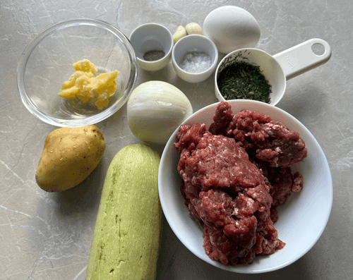 Put minced meat, potatoes, zucchini, onion, garlic, dill, egg, salt and pepper into a bowl.
