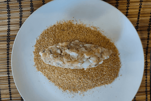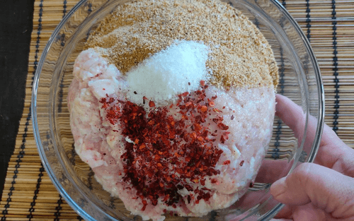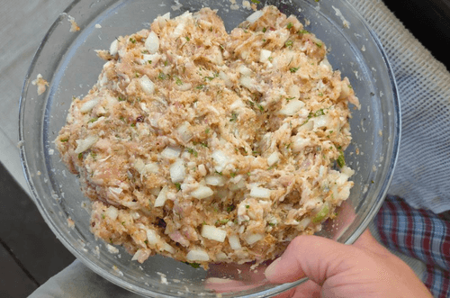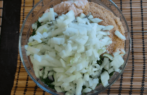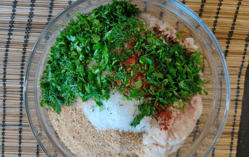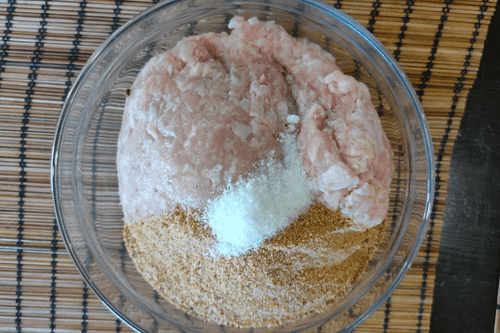 Add 2/3 of breadcrumbs and salt to the minced meat.