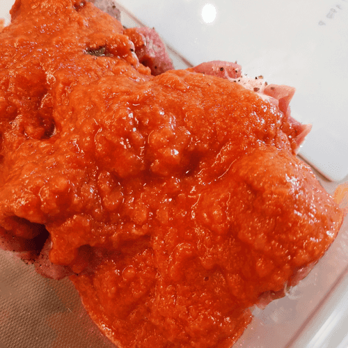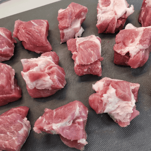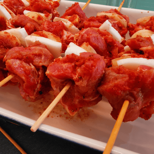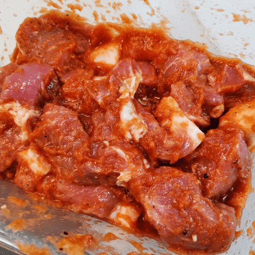 Skewer the meat, alternating each piece with fat. Place in a suitable baking dish so that the meat does not touch the bottom.