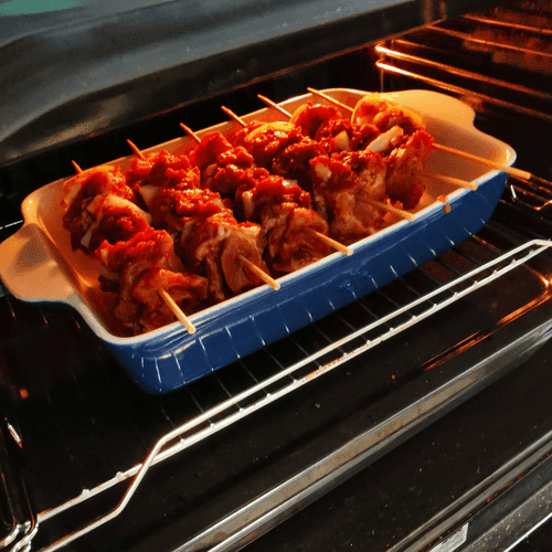 After 15 minutes, turn the skewers and return them to the oven, reducing the temperature to 180 degrees.