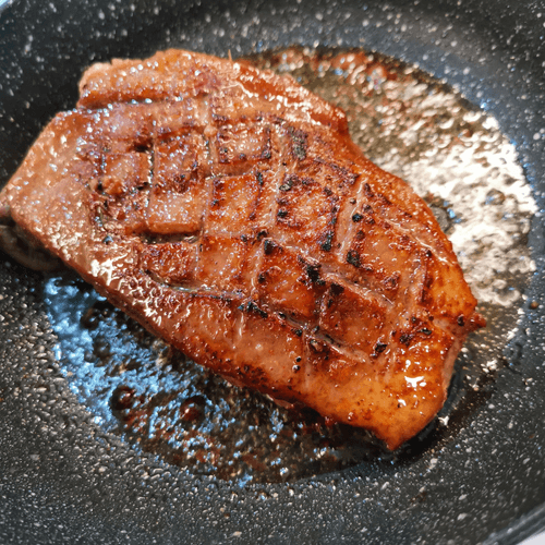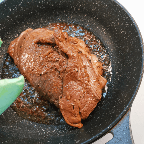 Once the skin is browned, flip it.