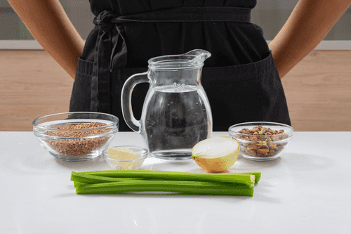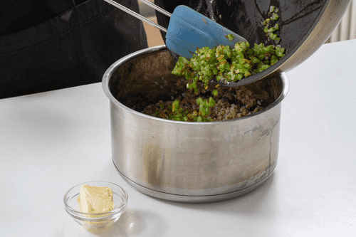 Add celery, onion, and a piece of cold butter to the porridge and mix.