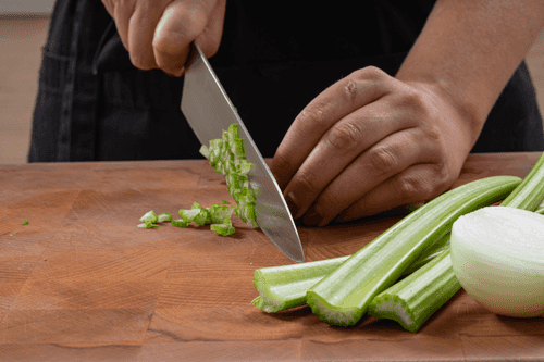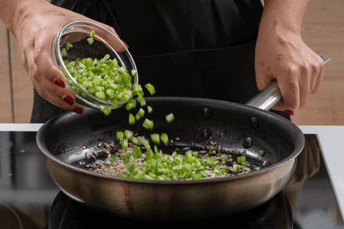 Add celery to the onion and sauté quickly for 5-7 minutes; it should remain slightly crunchy.