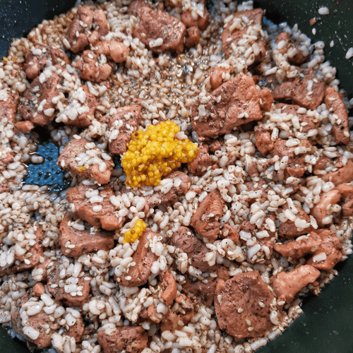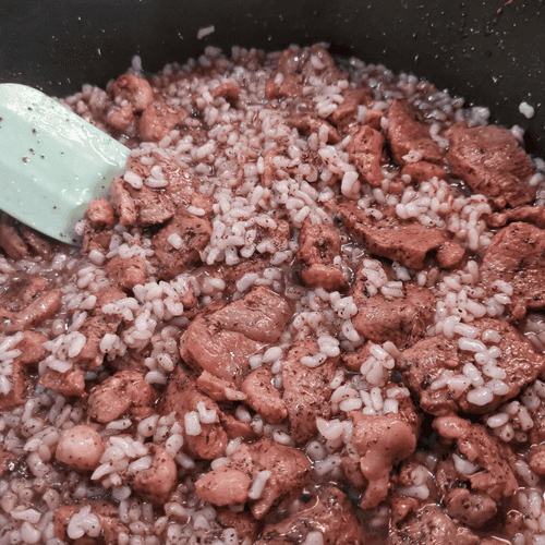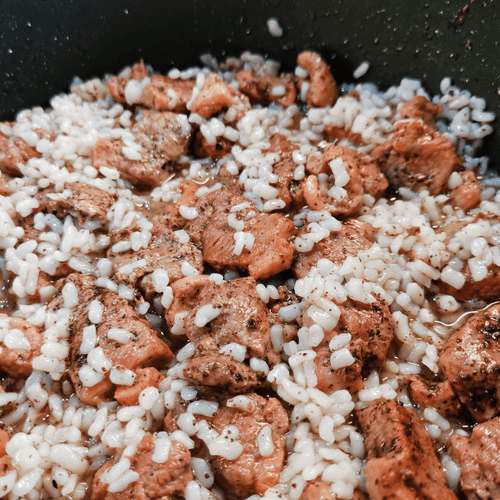 After 2-3 minutes, add rice to the duck and stir.
