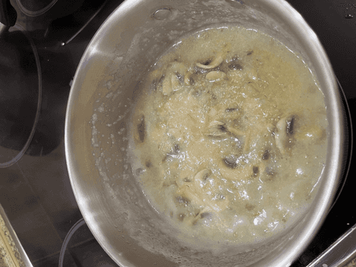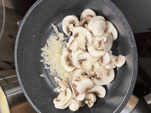 Slice the mushrooms thinly. Chop the onion finely. Sauté the mushrooms and onion (5–7 minutes).