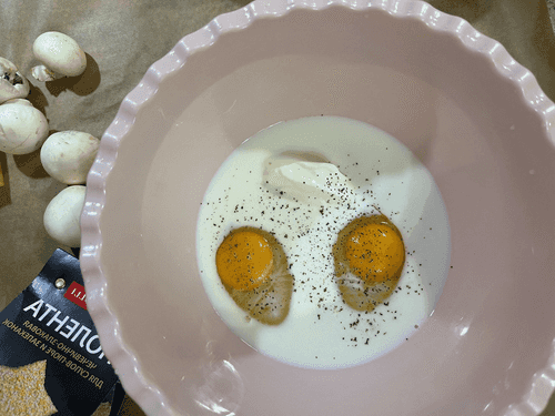 In a deep container, combine eggs, sour cream, milk, salt, and pepper. Whisk the mixture.