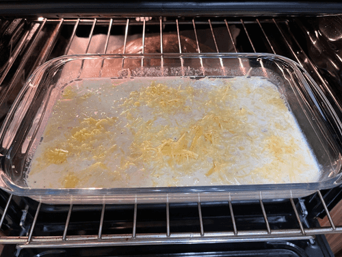 Pour into an oiled form, smooth the surface with a spoon, and bake. Sprinkle cheese on top. Bake in the oven for 20 minutes until done.
