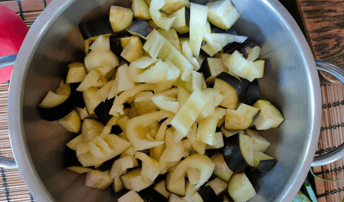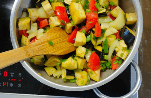 Mix the vegetable mixture in a pot and place it on the heat, adding half of the oil.