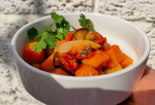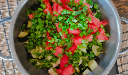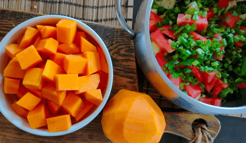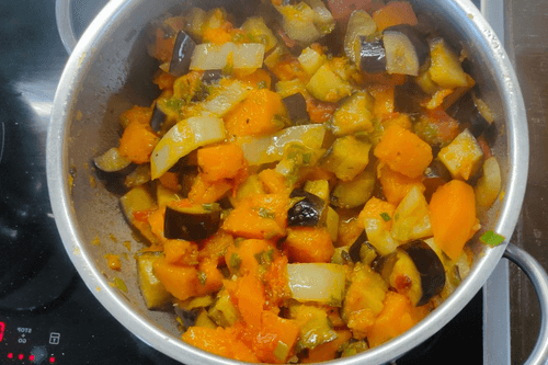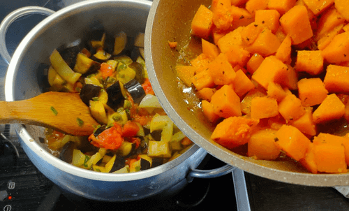 When the vegetables in both containers are almost ready, transfer the pumpkin to the pot with the other vegetables.