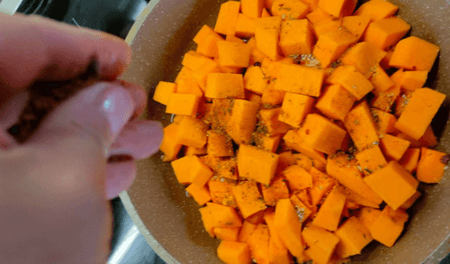 Season the pumpkin with vegetable spices, add oil to the pan, and fry until half cooked.