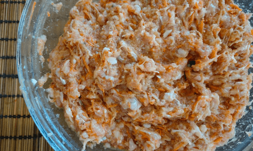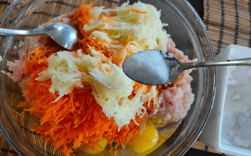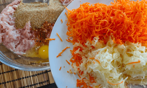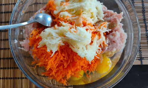 Add the grated vegetables to the bowl with the minced meat.