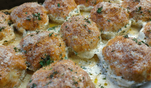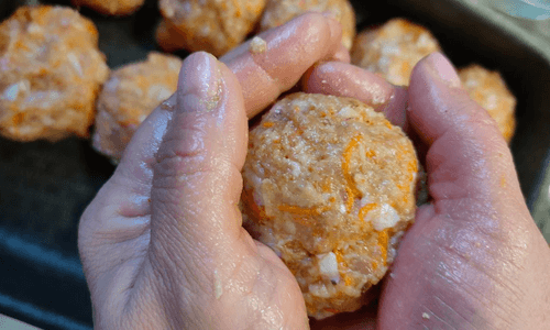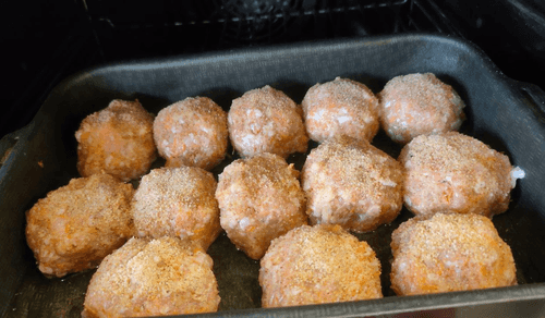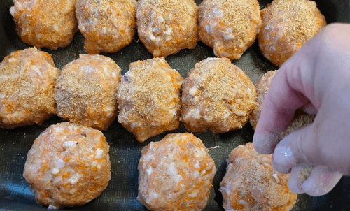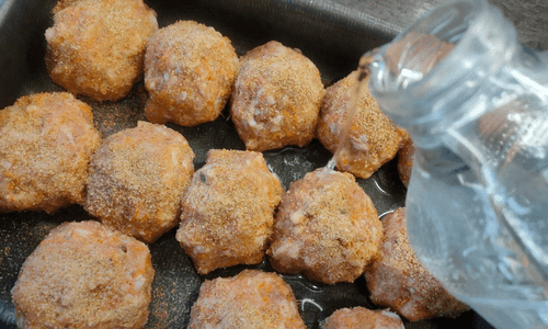Form small balls with wet hands and place them in a baking dish.