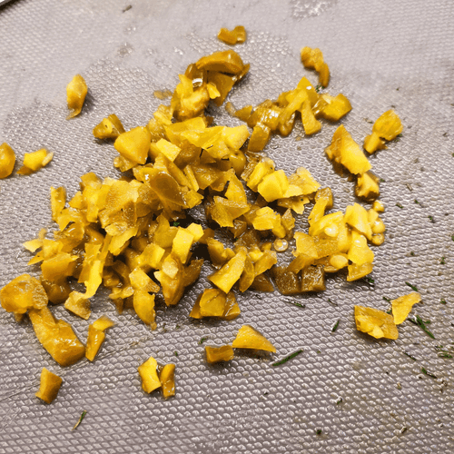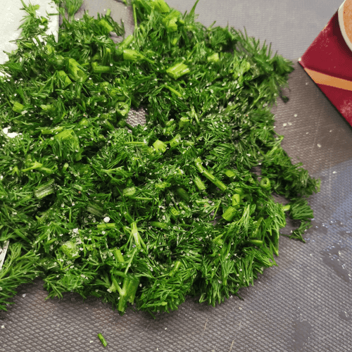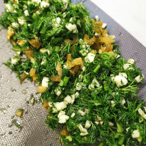 After 2 minutes, add the dill-garlic mixture with jalapeño. Mix thoroughly.