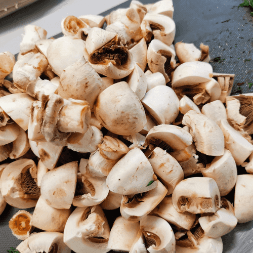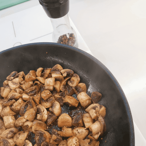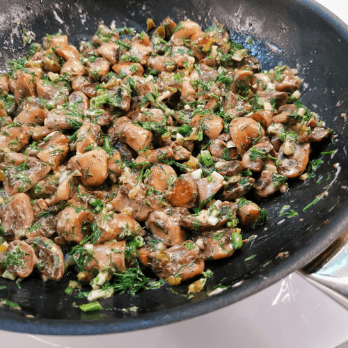 Add mushrooms to the heated olive and butter in the pan. Stir.
