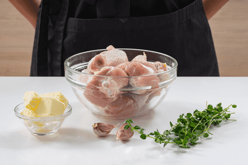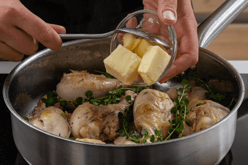 Add garlic, thyme sprigs, and butter to the pan with the chicken.
