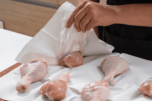 Pat the chicken drumsticks dry with a paper towel for better frying.