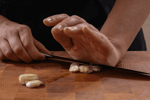 Peel the garlic and crush the cloves with the flat side of a knife.