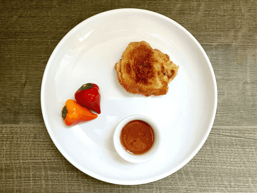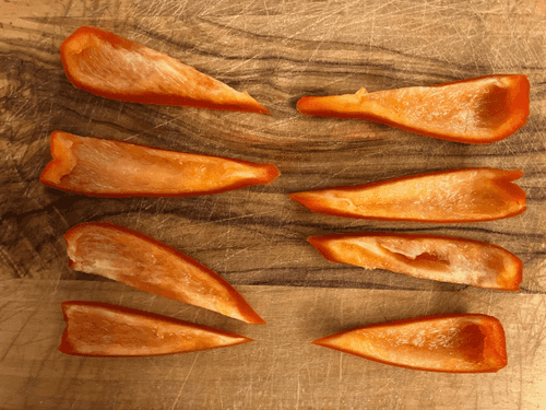 Remove from the oven and let cool. Garnish with peppers and spicy tomato sauce when serving.