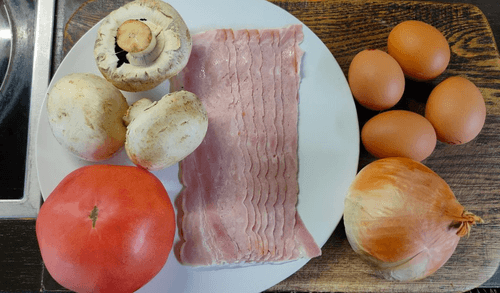 Scrambled eggs with bacon, onions, tomatoes and mushrooms